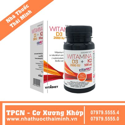 Viên uống WITAMINA D3 + K2 (60 Viên) nhập khẩu từ Ba Lan giúp tăng cường hấp thụ canxi, bổ sung vitamin d3 và k2 cho cơ thể.